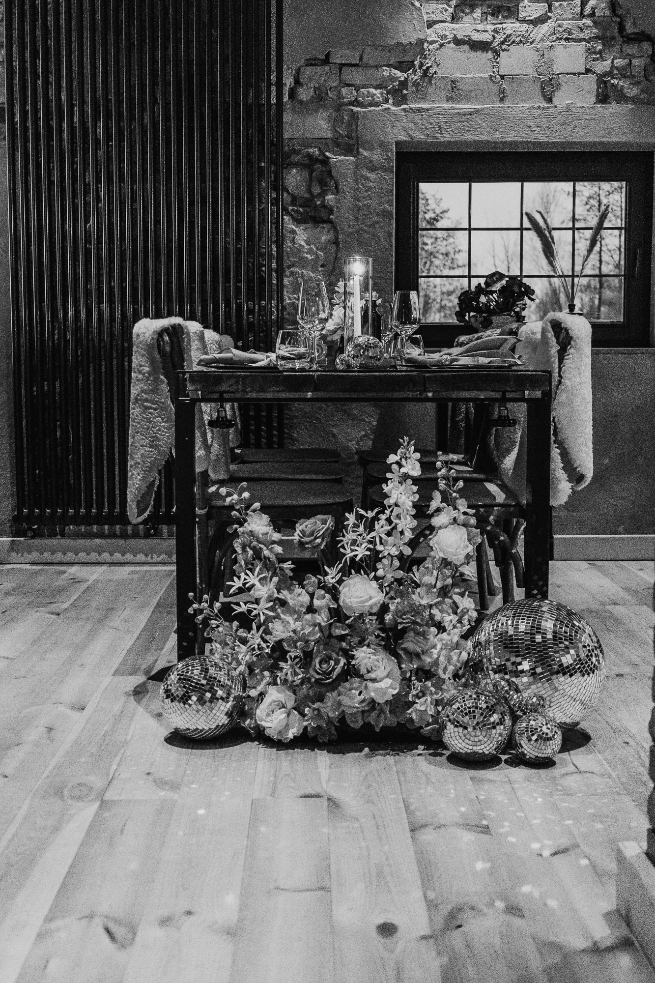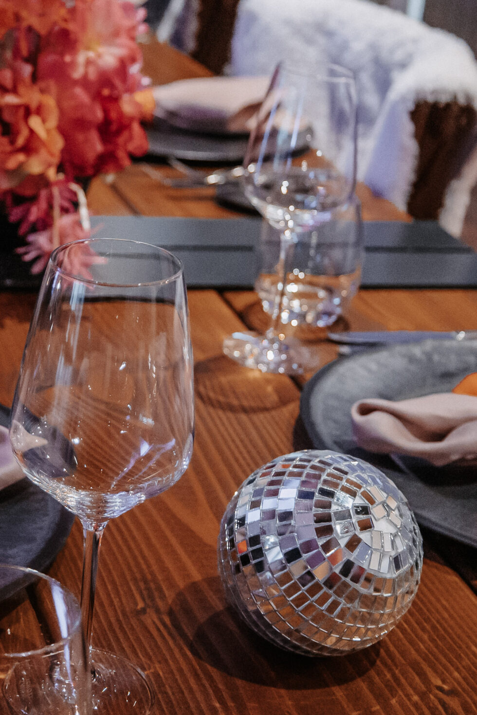 Ein Fest für die Sinne: Besonders geliebt, haben wir die Spiegelkugeln, die wir auf den Tischen und im Raum verteilten. Sie fingen das Licht ein und warfen funkelnde Reflexionen auf Böden, Wände und Decken, wodurch eine mitreißende Atmosphäre entstand. Ein weiteres Highlight war der Traubogen mit geometrischen Formen, der das gesamte Konzept perfekt aufgriff.