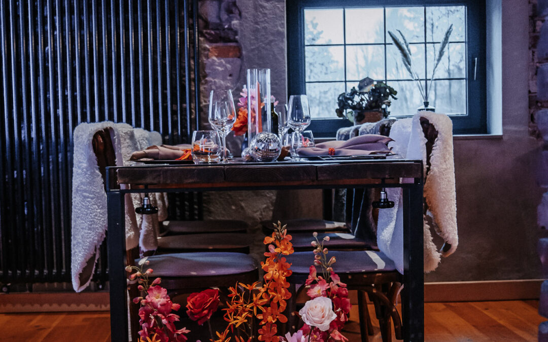 Wir hatten kürzlich das Vergnügen, die Dekoration und Floristik für das B-Schnuppern in der Seescheune in Buldern zu gestalten. Die Seescheune und der angrenzende Seesaal sind eine unserer absoluten Lieblingslocations, weil sie so wandelbar sind. Diesmal haben wir sie in ein wahres Farbenmeer der 70er-Jahre-Disco-Ära verwandelt.
