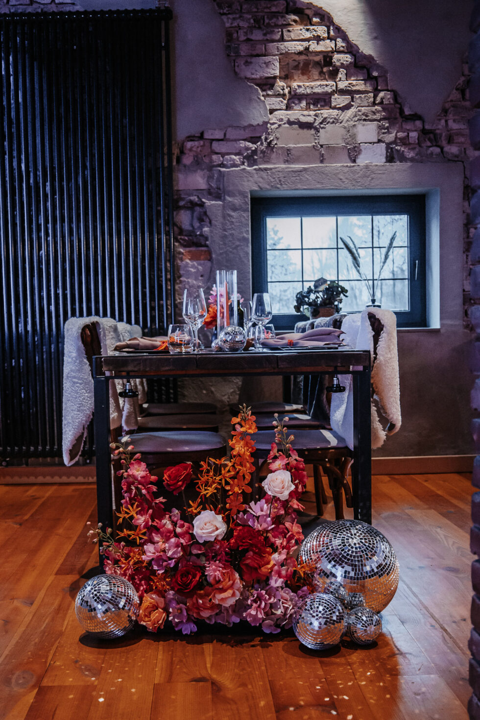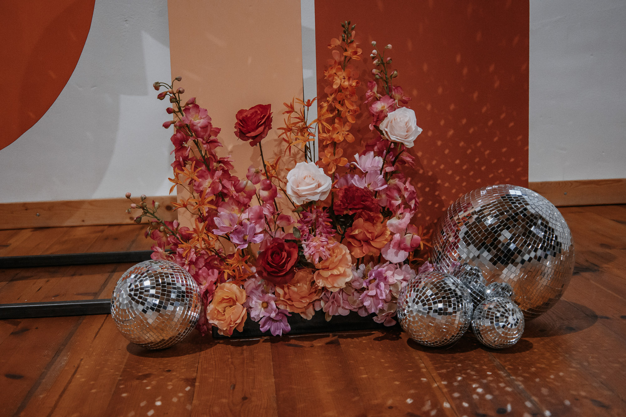 Ein farbenfrohes Konzept der 70er-Jahre-Disco-Ära: Inspiriert von den lebhaften Farben und der Energie dieser Ära, haben wir uns für knallig bunte Pink- und Orangetöne entschieden. Unsere Blumen verzichteten bewusst auf Grün und erstrahlten stattdessen in leuchtenden Farben, die sofort ins Auge sprangen.