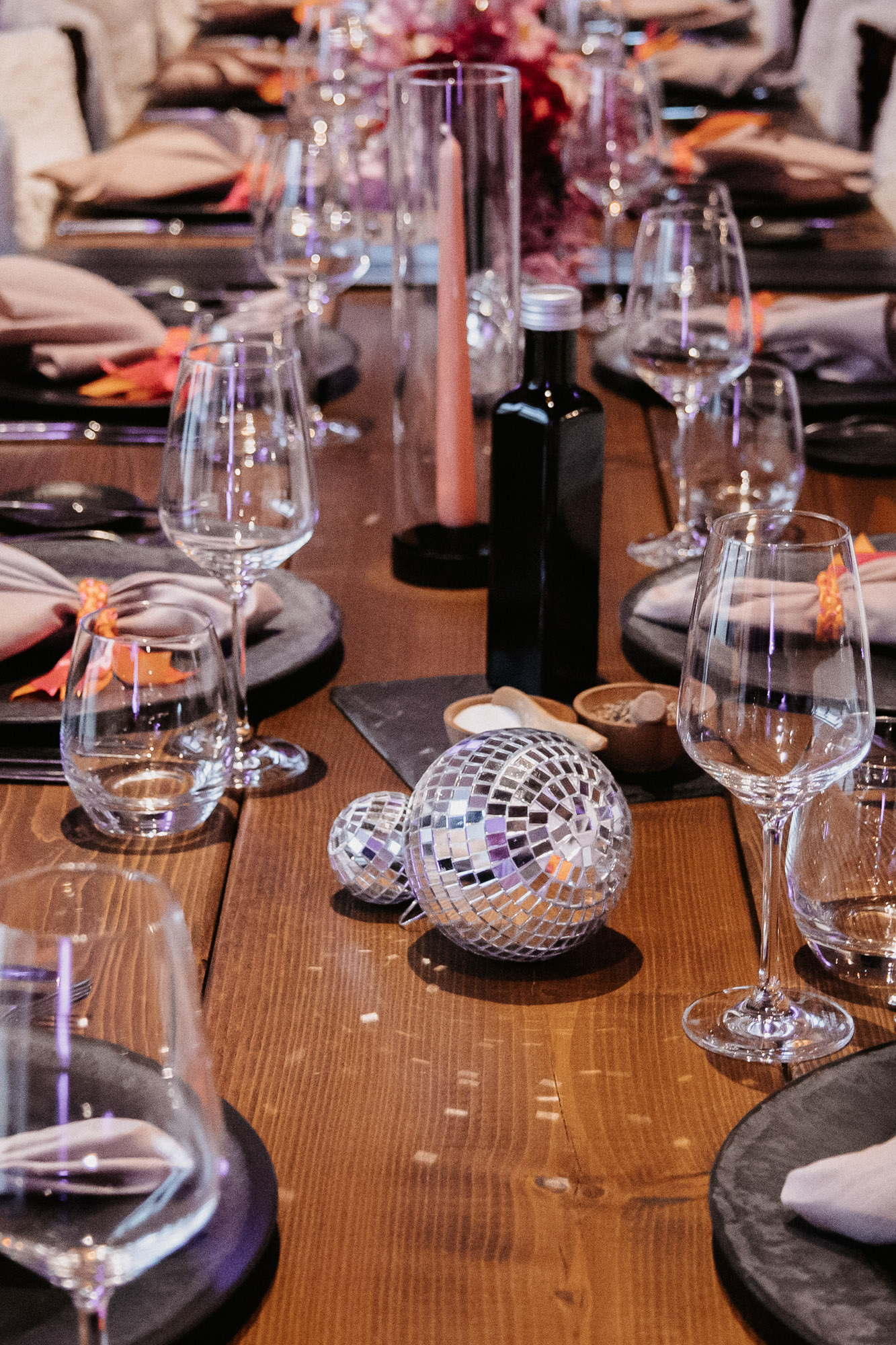 Harmonie zwischen Deko und Location: Die rustikalen Holztische mit schwarzen Details bildeten eine ideale Bühne für unser kräftiges Farbkonzept. Die Ambientebeleuchtung des Seesaals tauchten wir passend in Pink, um eine stimmige Atmosphäre zu schaffen. Kerzen in Orange, gehalten von schwarzen Kerzenhaltern, rundeten das Gesamtbild ab, das stilvoll, nicht zu überladen und dennoch passend zum rustikalen Charme des Seesaals war.