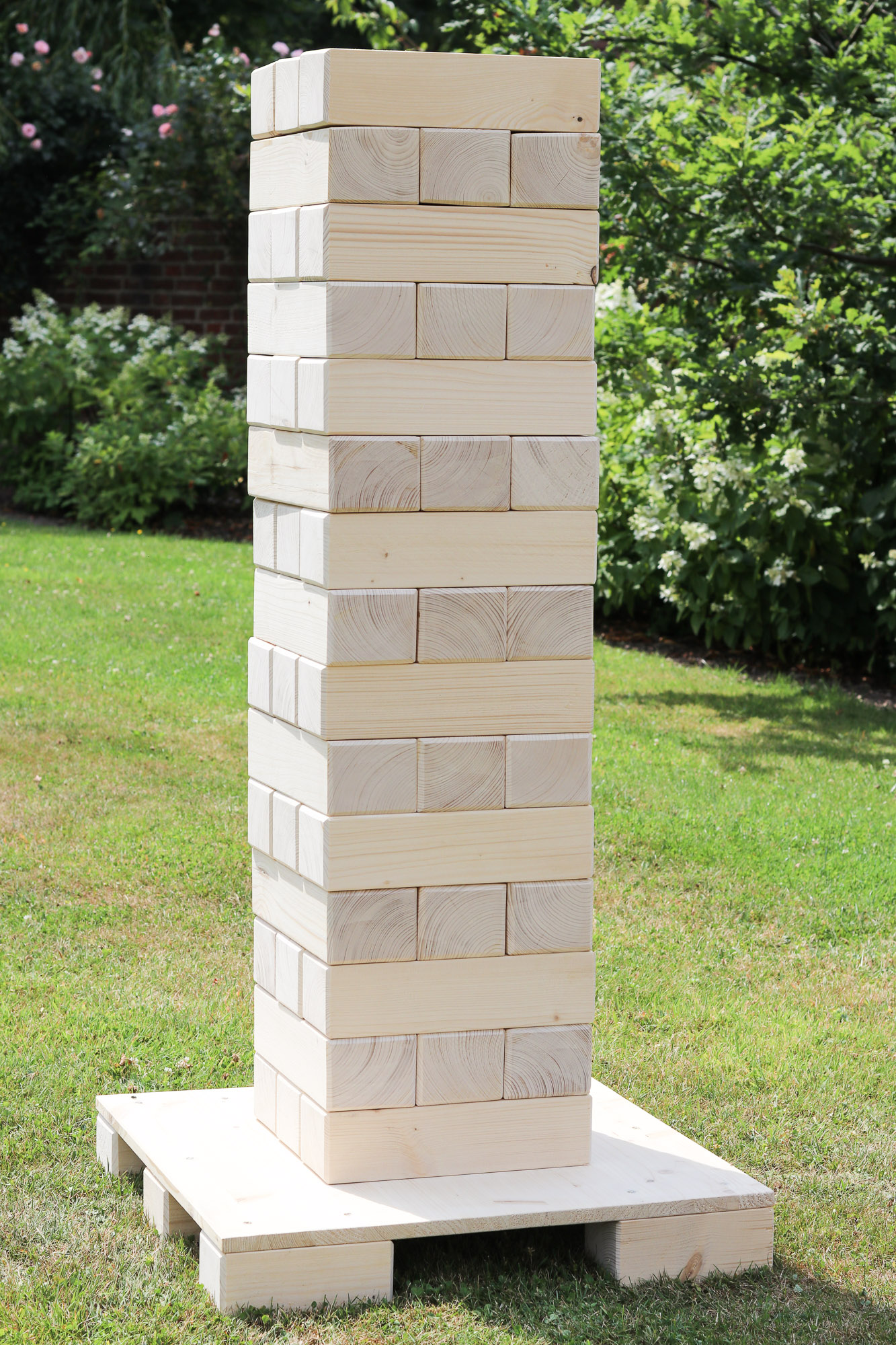 Ihr wollt eine tolle Beschäftigung für eure Hochzeit zwischen Trauung und Essen? Der Riesen-Holzturm macht Erwachsenen genauso viel Spaß wie Kindern. Die Kinder sollten allerdings unter Aufsicht verwenden und schon etwas größer sein, da der Turm schnell 2m Höhe erreicht.