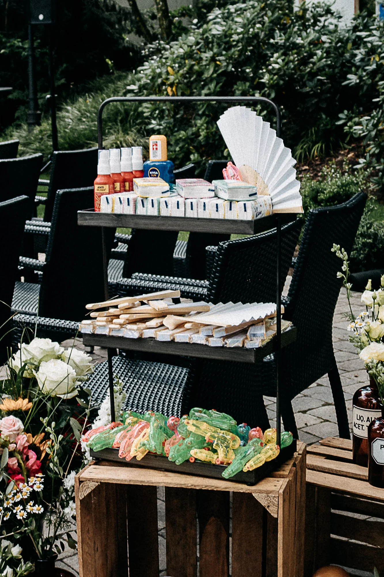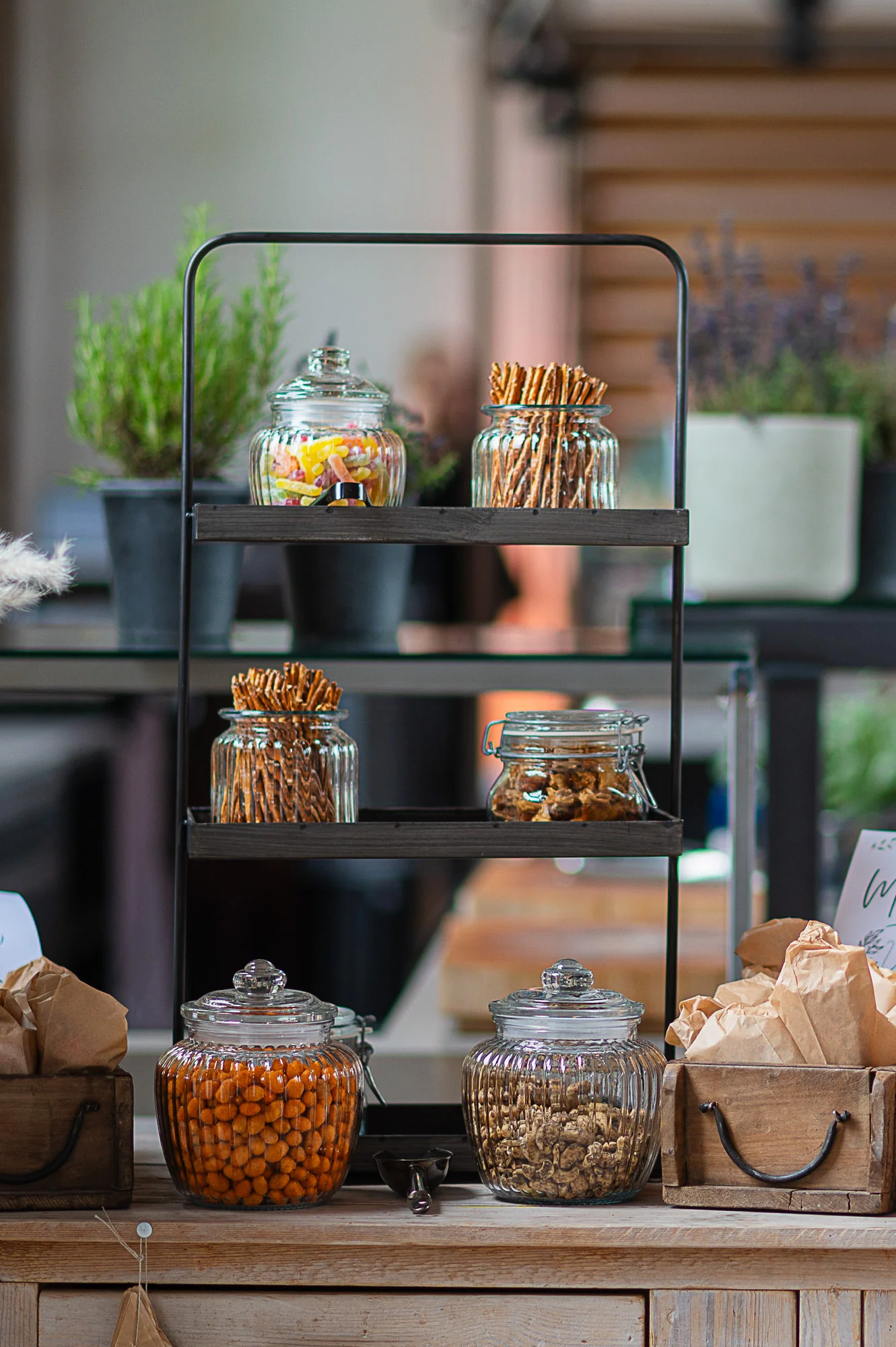 Regal mit drei Holzebenen und Metallrahmen – perfekt, um liebevolle Stationen zu gestalten, z. B. Fächer, Taschentücher oder Snacks.