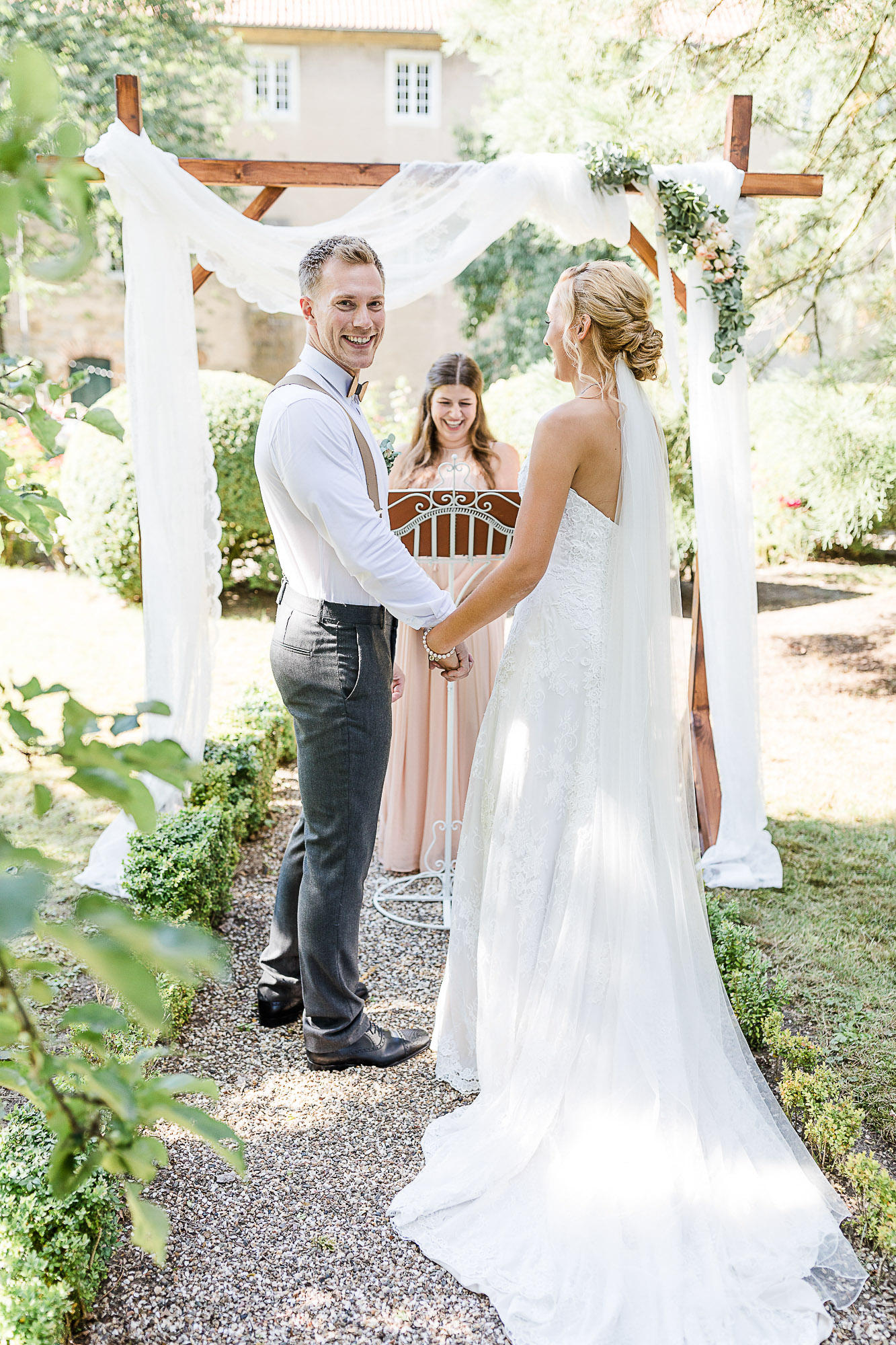 Die Vorhänge lassen sich einzeln oder gemeinsam arrangieren und bringen sofort eine elegante, natürliche Atmosphäre in euer Trausetting.