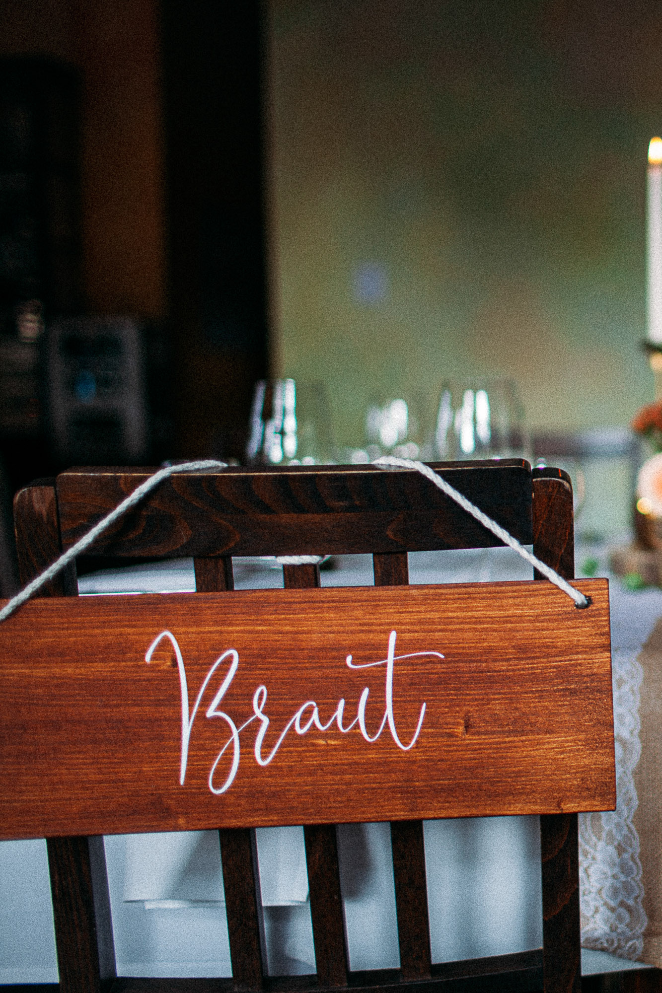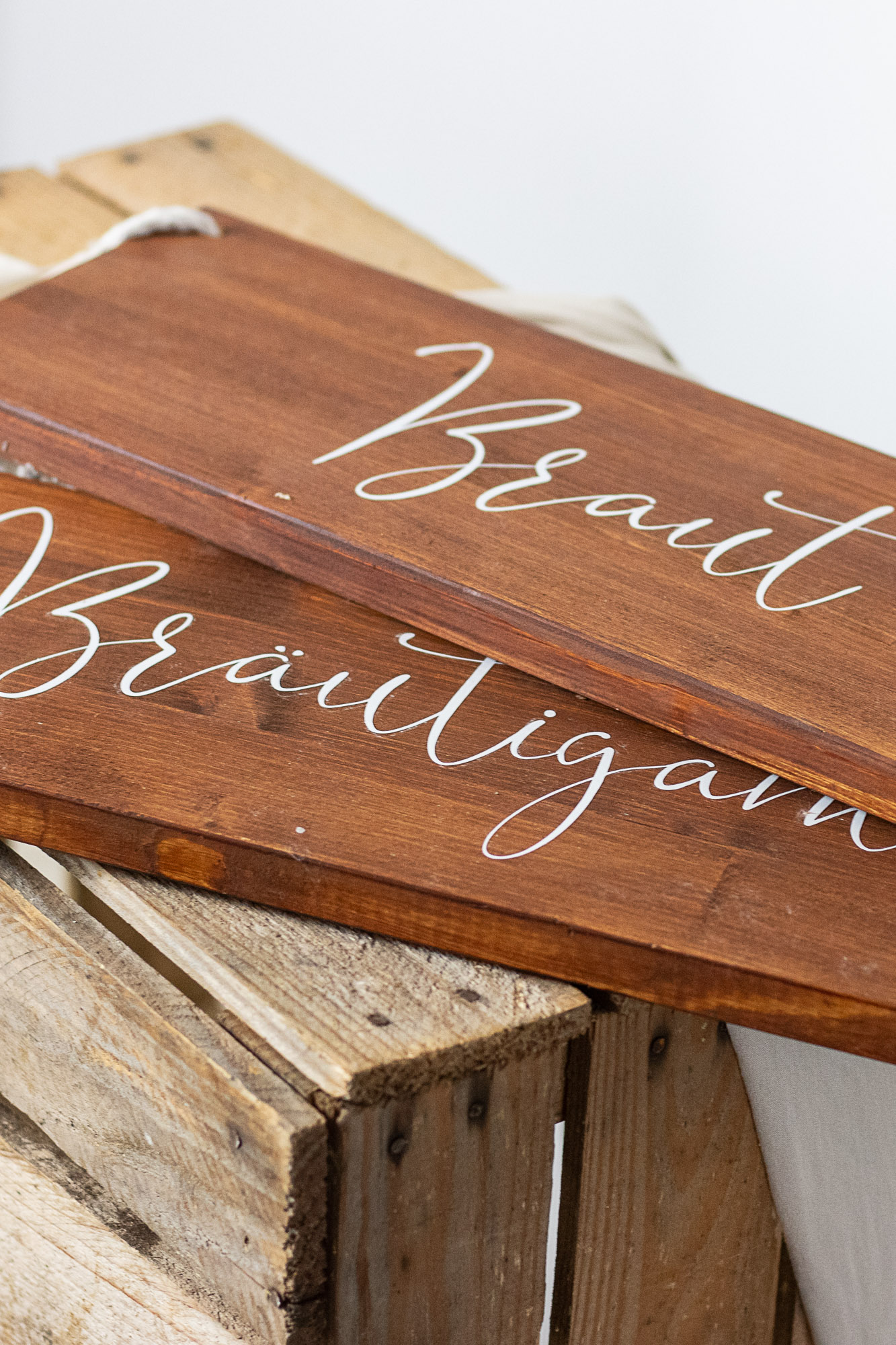 Zwei Stuhlanhänger mit der Aufschrift Braut und Bräutigam – ein liebevolles Detail für euer Trausetting oder die Dinnertafel.