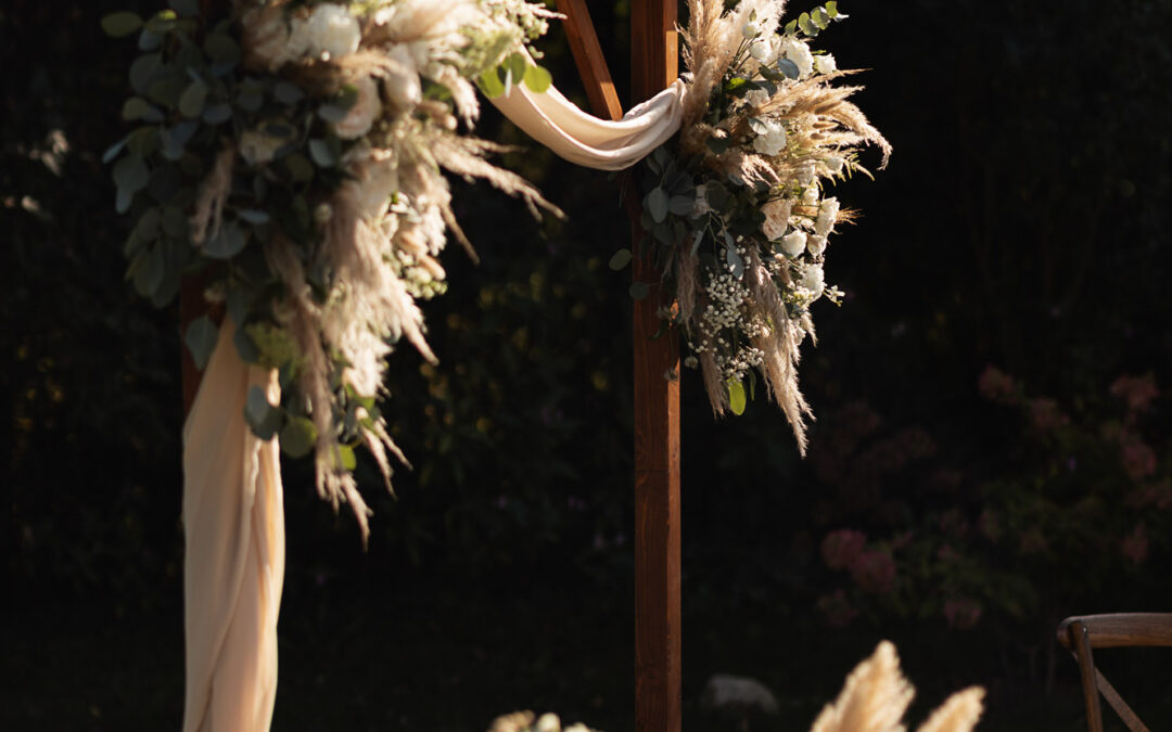 Bei der Trauung unterscheide ich einmal in kirchliche Trauung und eine freie Trauung. Bei einer kirchlichen Trauung empfiehlt sich ein Altargesteck und florale Deko für die Sitzplätze der Brautleute und an den Gästebänken der Kirche. Hier gibt es auch wieder vielfältige Möglichkeiten, von einzelnen grünen Zweigen, über Sträuße, Gestecke ist vieles möglich. Häufig muss die Deko in der Kirche direkt nach der Trauung wieder entfernt werden. Eure Deko sollte daher schnell abzubauen sein. Schau am besten außerdem mal, ob du diese dann nicht in eurer Feierlocation wieder verwenden kannst. Eine freie Trauung ist im Vergleich zu einer kirchlicher Trauung meist üppiger dekoriert. Zu der Dekoation für den Weg zur Trauung, gesellt sich meist größere florale Elemente, die den Ort, an dem das Brautpaar sitzt, schmücken. Ist ein Traubogen vorhanden, kann dieser natürlich sehr gut mit Gestecken behängt werden. Aber auch Bodengestecke oder eine Mischung aus Vasen ergeben eine schöne Szenerie.